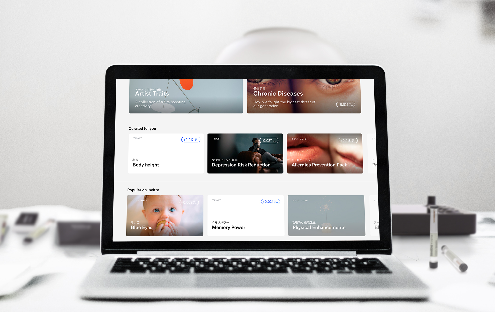 Invitro is offering human genome editing as a service. By selling genetic traits via a consumerized web shop, Invitro enables their customers to browse through curated offerings, get inspired and eventually find the right traits for their planed children. The web shop is build around the genome score, where each trait is marked with the expected score improvement, to guide and support decision-making of the consumer.